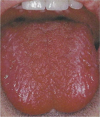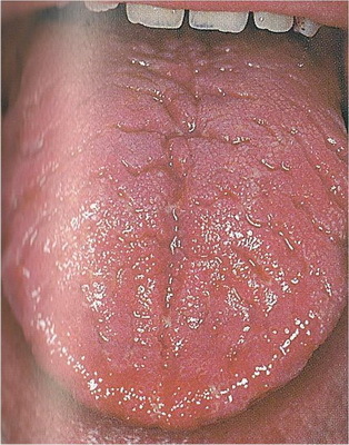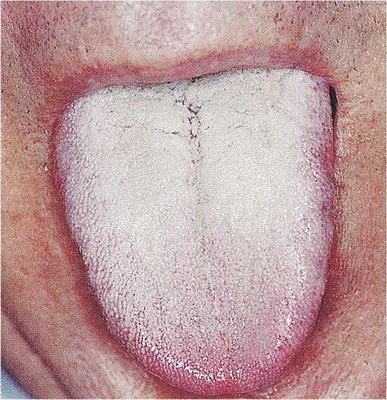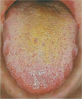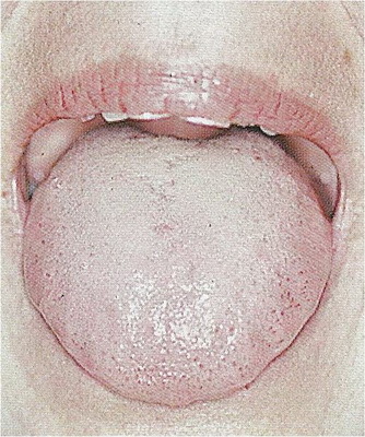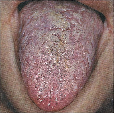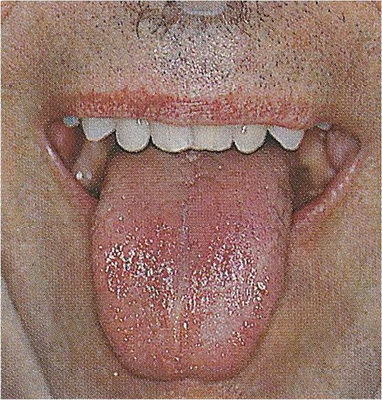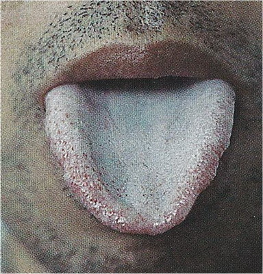 Oproti kluzkému jazyku lze rozeznat papily, má více hlenů než vody, je drsnější. Oba jsou silnější uprostřed jazyka, jsou zakořeněné, svědčí pro prázdnotu jangu. |